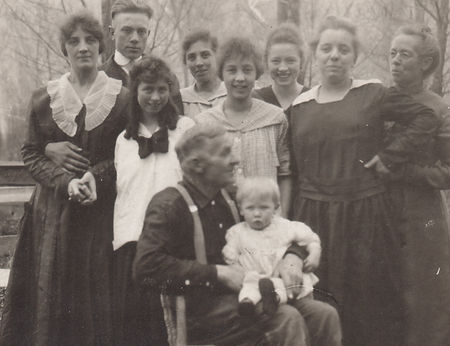 [Photo - about 1916 - Grandpa Simon E. Dalton with children and grandchildren. l to r: Jenny, Gene, Nancy, Ella, Emma?, Arlean, Hilda, Jane. On Grandpa's lap is little Marian Miner - my mother!]